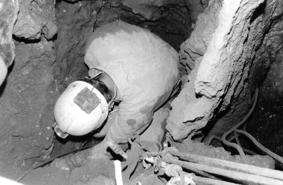 Le premier chantier de désob de la salle du mythe de Sisyphe à -150m, qui donne sur le Puits de l'hippocampe (P90)